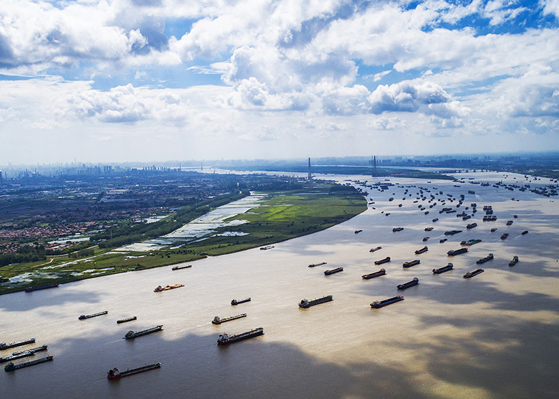船舶在湖北省武漢市陽(yáng)邏港區(qū)水域行駛(2018年8月13日攝,無(wú)人機(jī)照片)。新華社記者 肖藝九 攝
