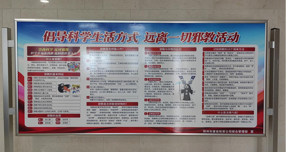 為了進(jìn)一步提高國(guó)企員工反邪教意識(shí),認(rèn)識(shí)邪教的危害,切實(shí)增強(qiáng)自覺抵御邪教侵蝕的能力,營(yíng)造積極向上、健康和諧的工作氛圍。4月25日下午,鄭州市建設(shè)投資集團(tuán)有限公司組織全體干部員工開展反對(duì)邪教宣傳活動(dòng)。利用PPT宣講、宣傳展板、網(wǎng)站、懸掛橫幅等方式,向員工宣傳邪教的種類、危害和邪教組織的種類等,引導(dǎo)國(guó)企干部職工認(rèn)清邪教本質(zhì),提高識(shí)邪、防邪、拒邪能力,筑牢反邪教思想防線,做到對(duì)邪教歪理邪說不聽、不看、不信、不傳。