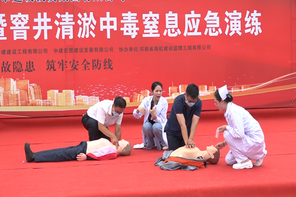 五是開展應急演練活動。6月23日下午,集團公司市政建設管理中心在杏賈路市政道路施工現(xiàn)場開展一次窨井中毒窒息應急救援演練活動,參加人員共計100余人,涉及公司所有在建市政工程項目參建單位。演練模擬污水井清淤作業(yè)意外中毒為背景展開,并邀請鄭大一附院兩名專家進行急救知識講解和心肺復蘇教學,取得了非常好的效果