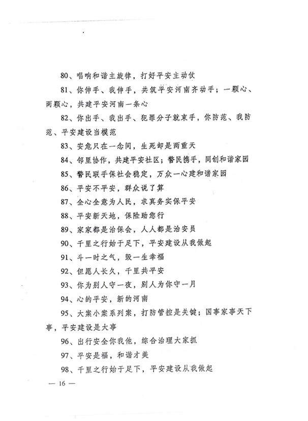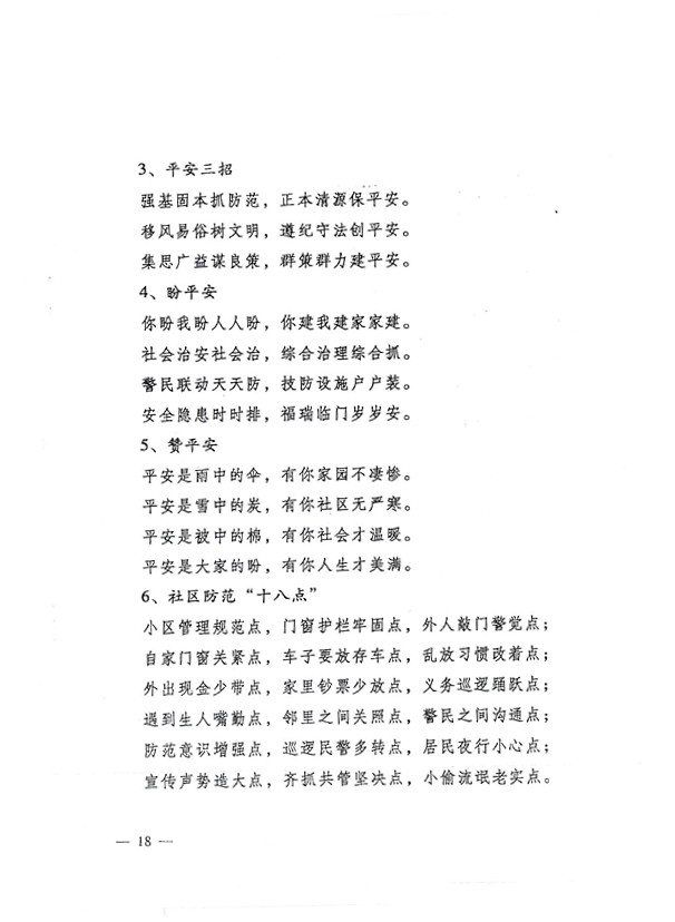 平安兩字重千斤,社會穩(wěn)定得民心。 創(chuàng)建平安人人有責(zé),構(gòu)建和諧人人參與。